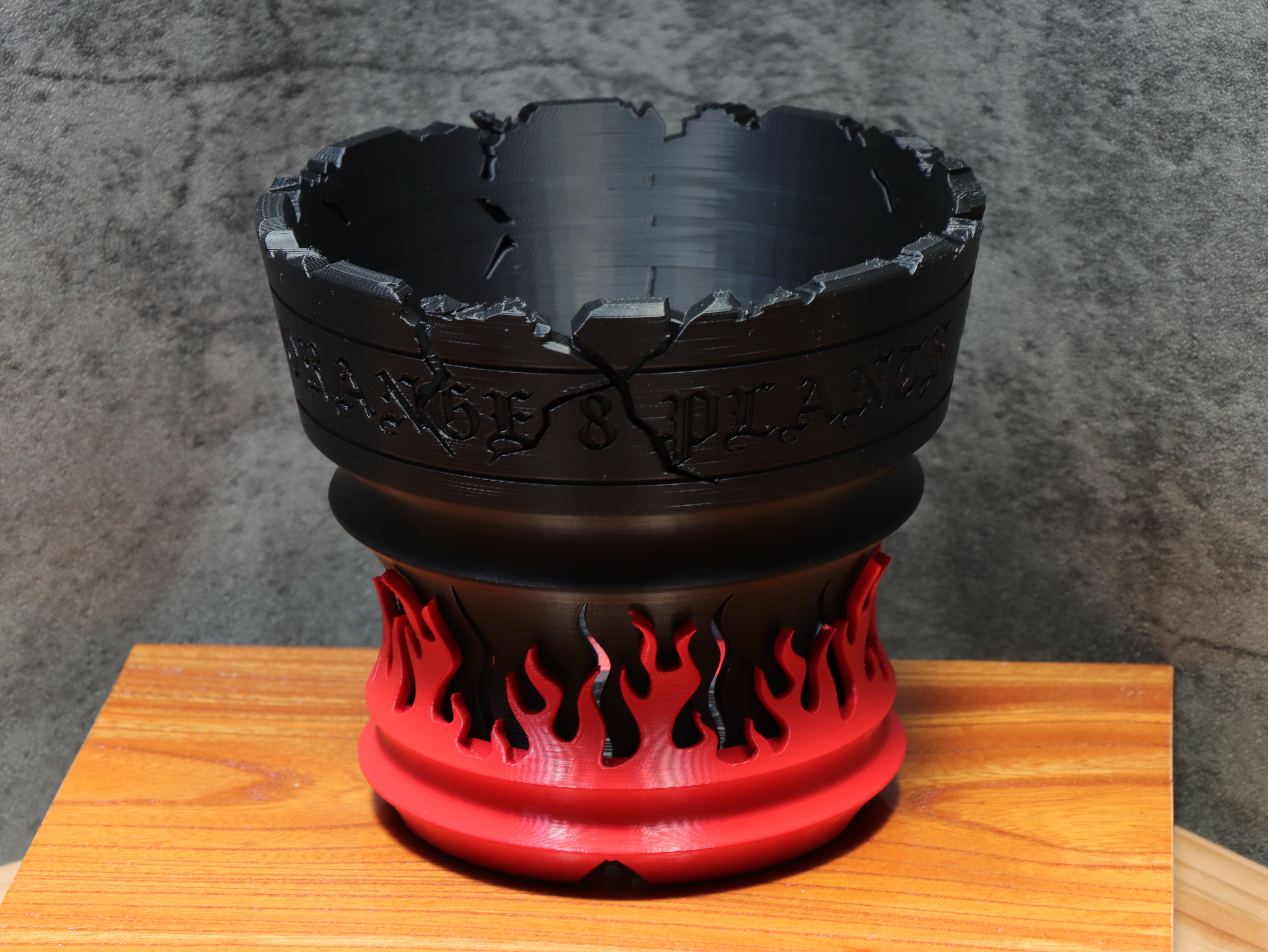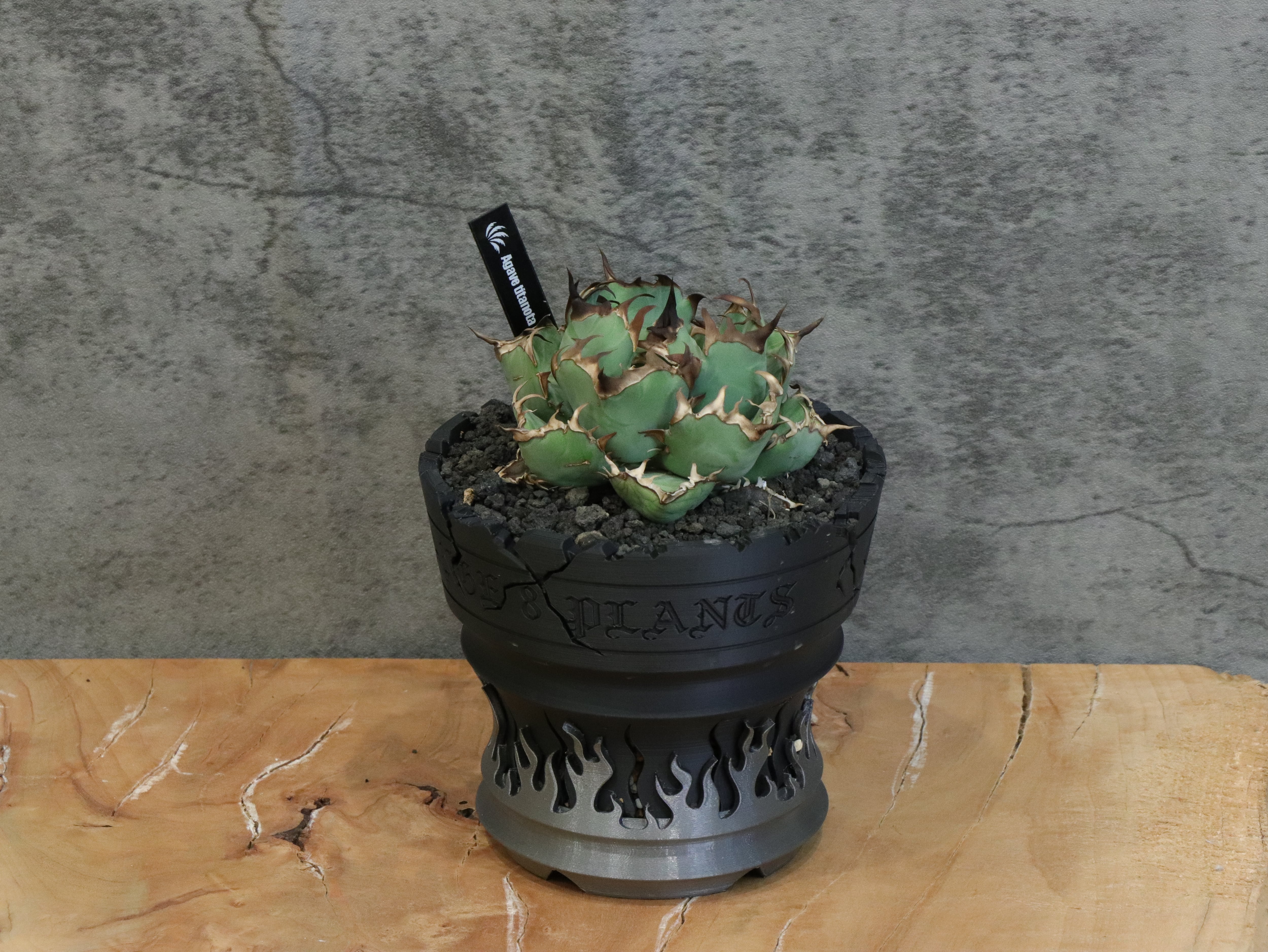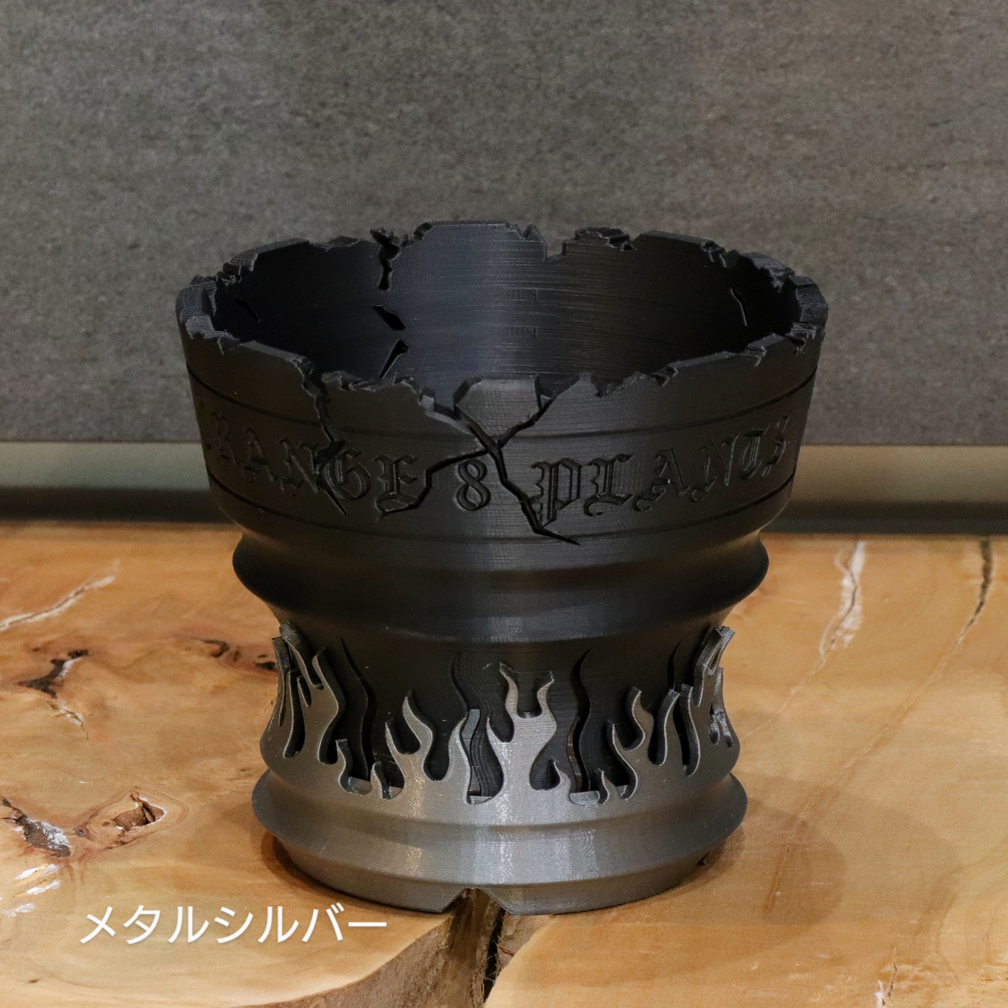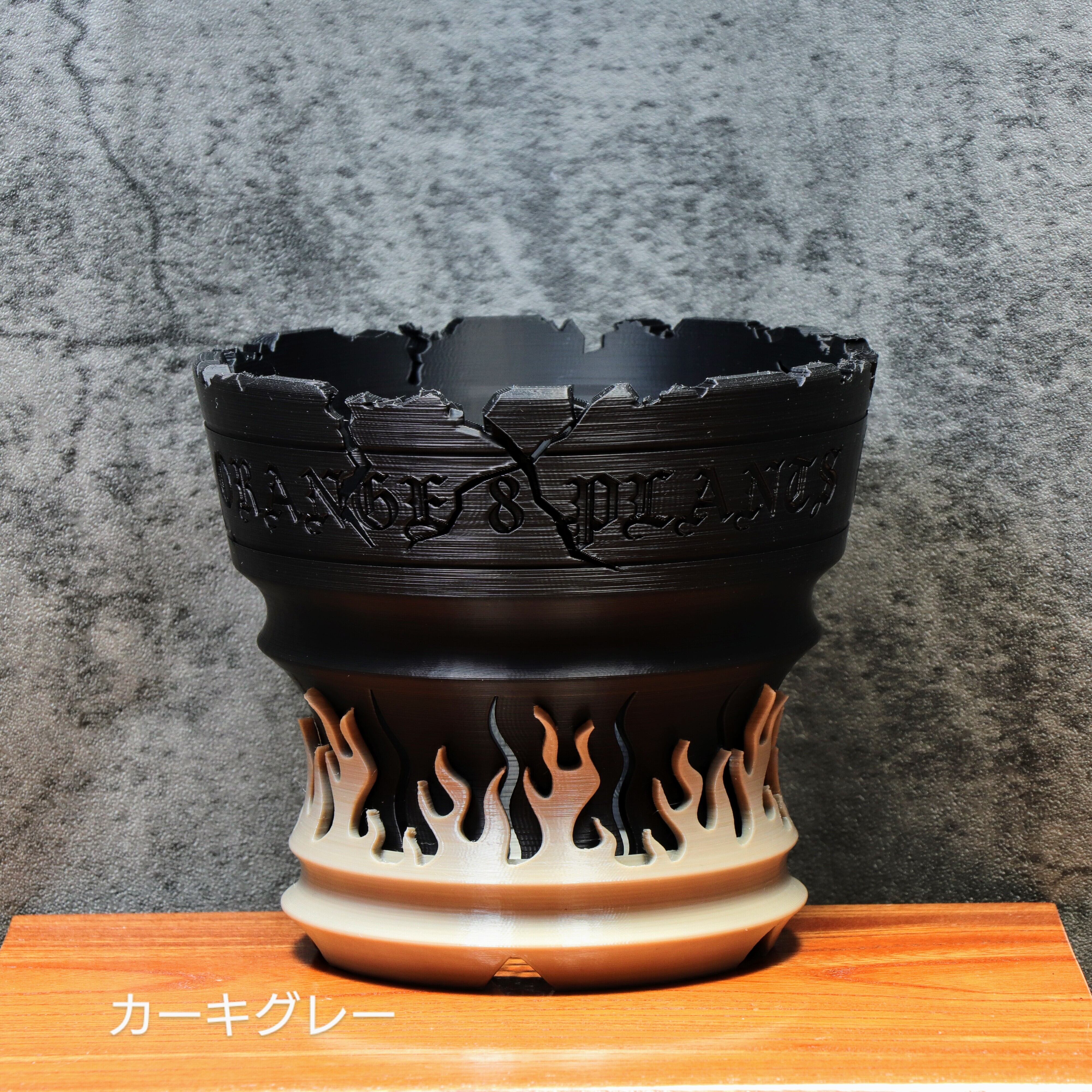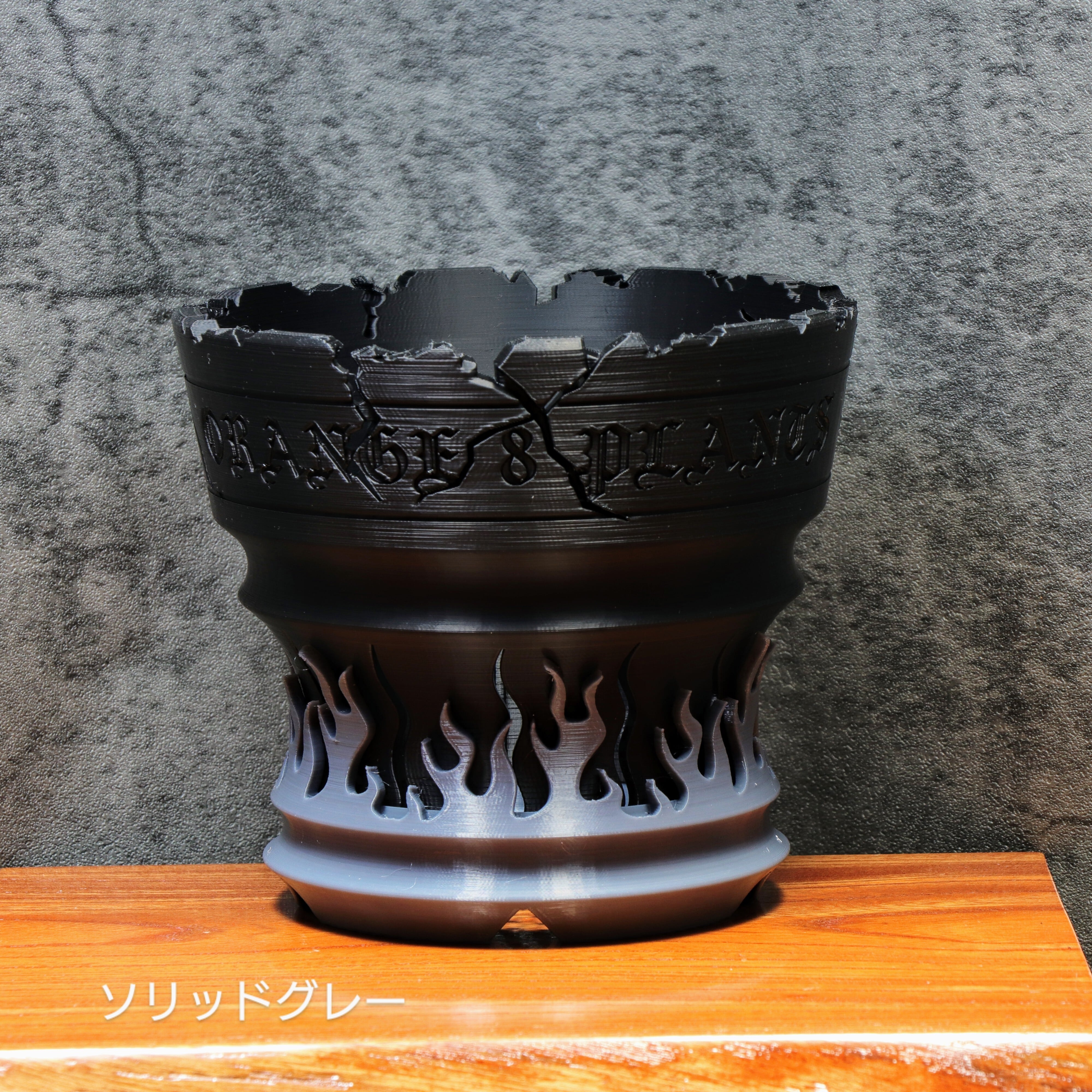 炎の力強さと影の美しさを融合させたデザインが特徴のアガベ用植木鉢。 闇に浮かび上がる炎のシルエット。焼け崩れたようなエッジが独特の存在感を放つ、唯一無二の植木鉢。